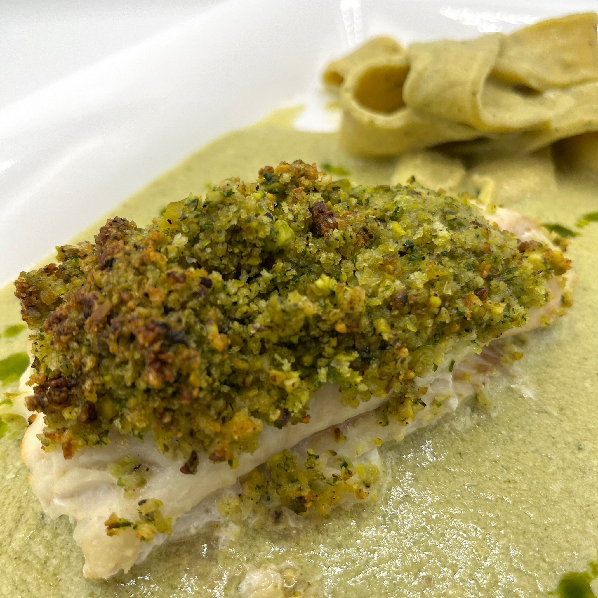 Fresh cod loin topped with pistachio crumbs, accompanied by a basil vinaigrette with coconut milk, lime and honey. Served with lemon basil pappardelle.