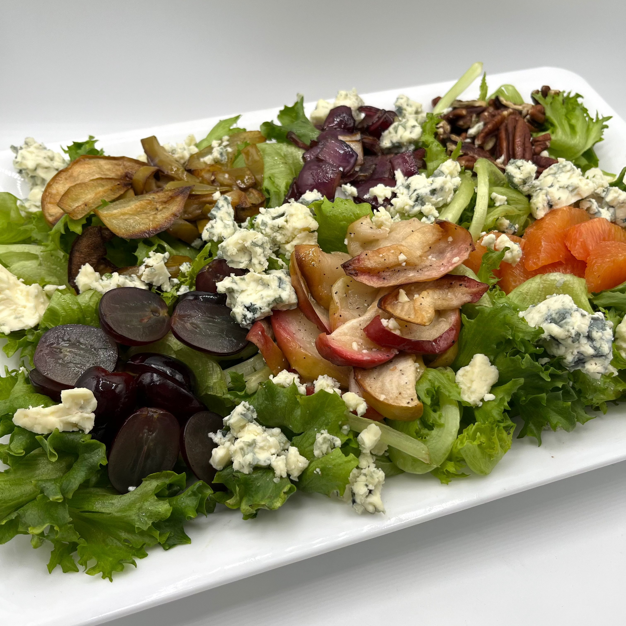 Mixed field greens, roasted Massachusetts’s apples, roasted red onions, spiced pecans, crumbled Great Hill blue cheese and honey white balsamic vinaigrette.